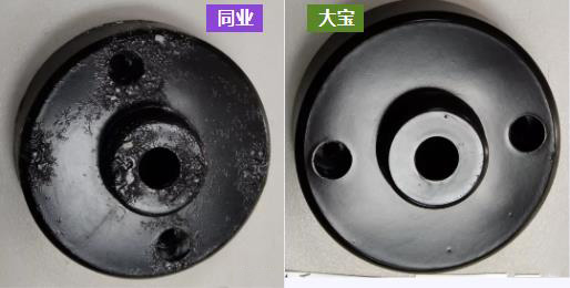 大寶漆與同業(yè)水性黑色啞光金屬烤漆在鋅合金素材上耐鹽霧500小時對比測試結果: