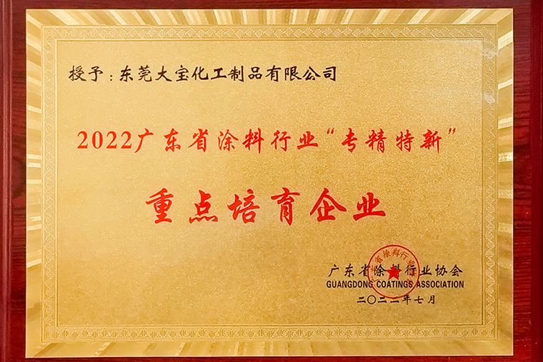東莞大寶化工制品有限公司獲得2022年廣東省涂料行業協會“專精特新”重點培育企業獎。