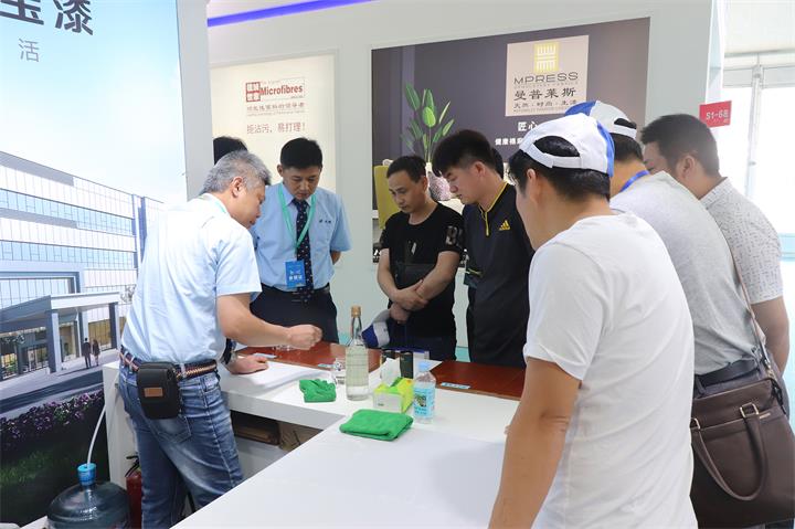 大寶漆作為國家高新技術企業(yè),緊扣“涂裝黑科技”的主題,在成都家具展重點展出了公司最近幾年研發(fā)突破的家具漆新工藝,包括:淺色科技木皮耐黃變高硬度系列、1度左右的PU全啞面漆系列、水性雙組份底面著色耐高溫系列、UV底面著色系列和格麗斯著色層次感強系列等,受到了參展的家具廠、涂料同行的關注。尤其是淺色科技木皮耐黃變高硬度系列和1度左右的PU面漆全啞涂裝系列,吸引了不少家具廠企業(yè)代表駐足觀看,了解產品信息,紛紛表達了合作意愿。