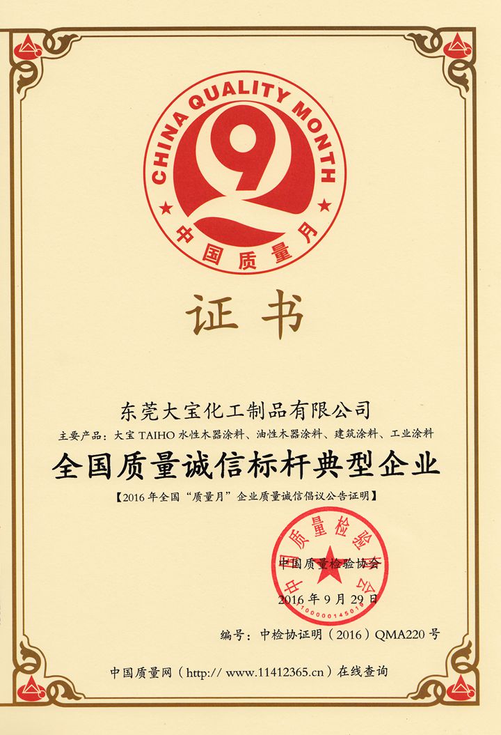 為推進建設質量強國,按照國務院辦公廳印發(fā)《貫徹實施質量發(fā)展綱要2016年行動計劃》的要求,并具體部署:中國質量檢驗協(xié)會繼續(xù)組織開展“企業(yè)質量誠信倡議”專題活動,助力“中國制造”品牌提升。中國質量檢驗協(xié)會組織開展的“企業(yè)質量誠信倡議”專題活動,對供給側改革、提升“中國制造”的品牌形象具有重要的意義,“全國質量誠信標桿典型企業(yè)”的授予,意味著大寶漆在企業(yè)誠信、產品質量上做的努力獲得了廣大消費者的認可!